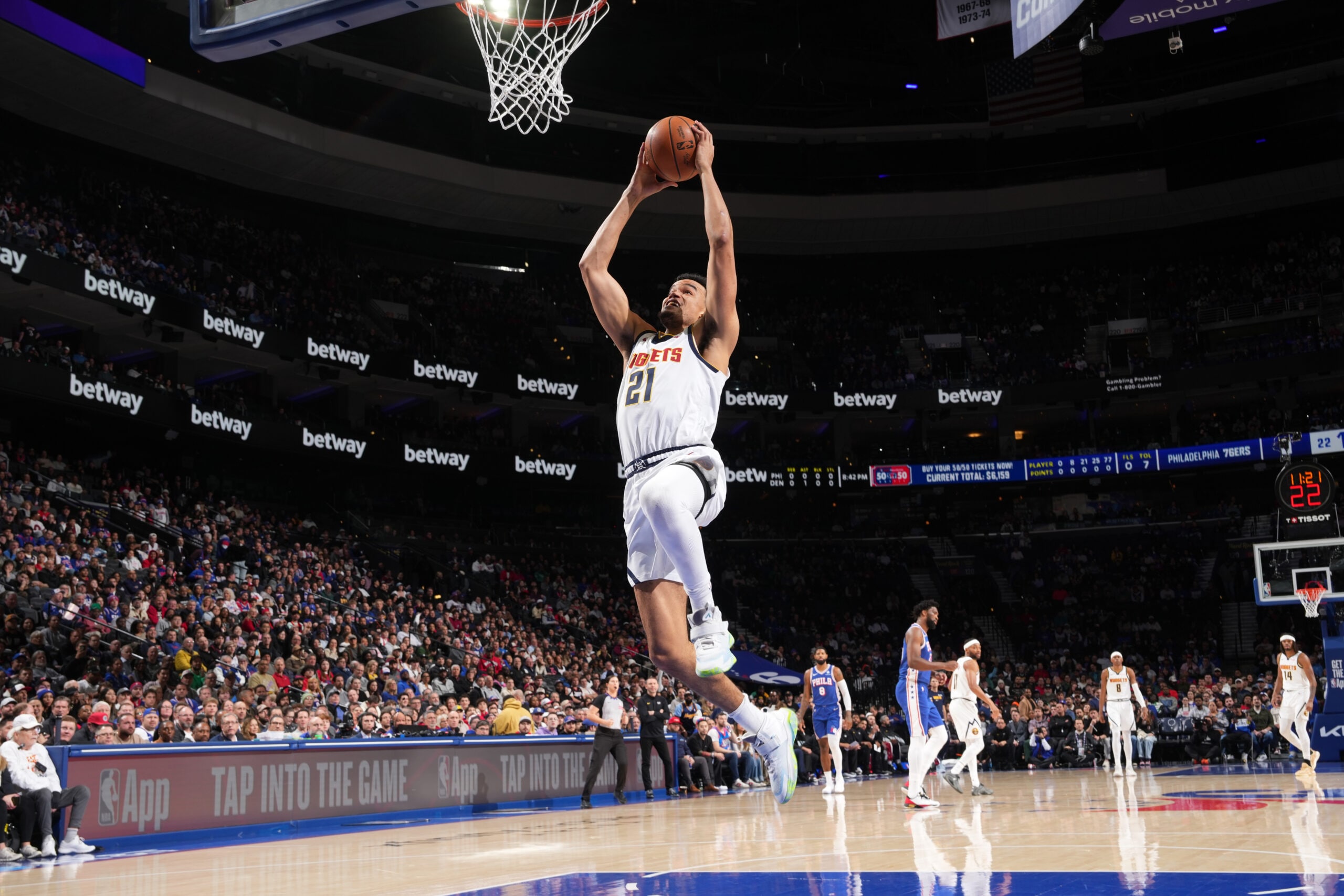 PHILADELPHIA, PA - JANUARY 5: Spencer Jones #21 of the Denver Nuggets dunks the ball during the game against the Philadelphia 76ers on January 5, 2026 at the Wells Fargo Center in Philadelphia, Pennsylvania NOTE TO USER: User expressly acknowledges and agrees that, by downloading and/or using this Photograph, user is consenting to the terms and conditions of the Getty Images License Agreement. Mandatory Copyright Notice: Copyright 2026 NBAE (Photo by Jesse D. Garrabrant/NBAE via Getty Images)